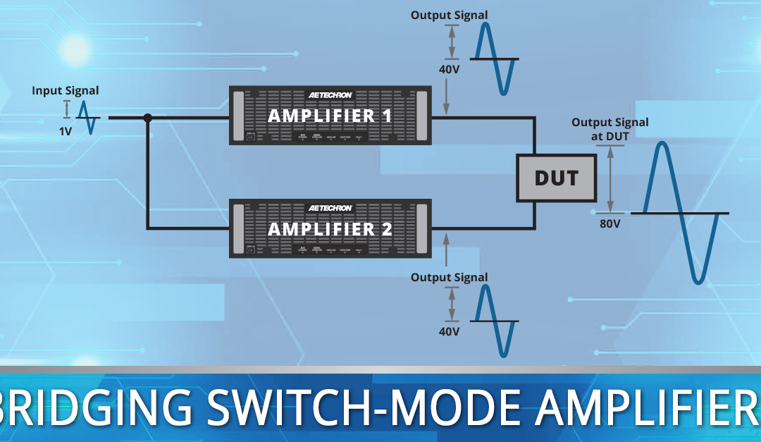 • A Bridge connection of two AE Techron amplifiers gives double the voltage, from DC to the highest frequency they can produce in a single sweep.  Without multiple additional external transformers.  It is also possible for a system configured in this way to produce unipolar pulses, square waves, and AC waveforms with a DC offset.  All things not possible with a transformer based solution.